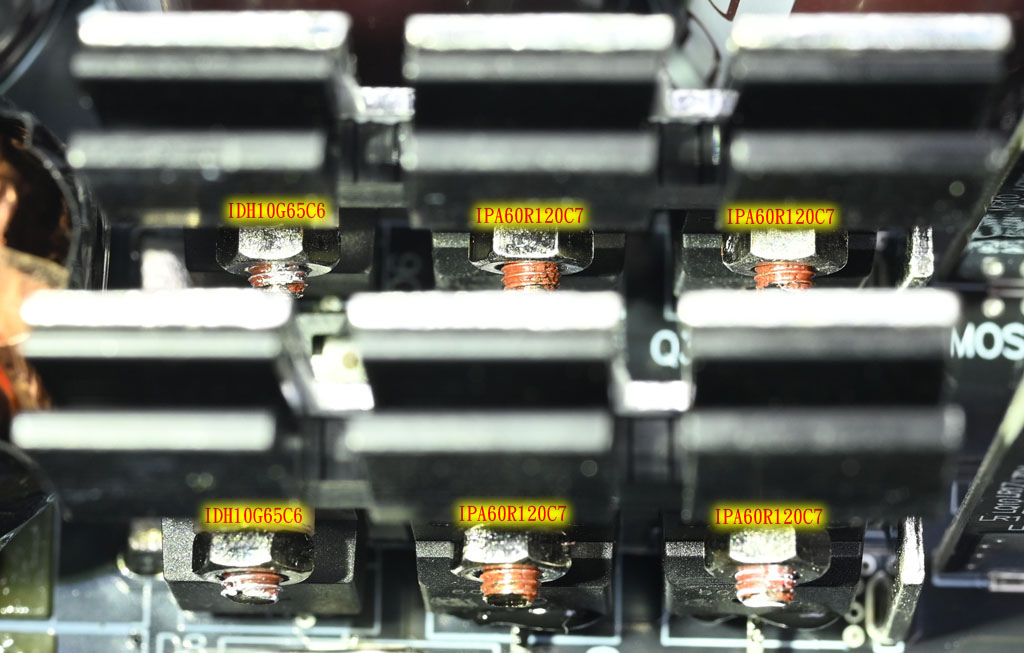 ▼交錯式APFC的2組功率元件安裝在2個散熱片,共有4個Infineon英飛凌IPA60R120C7全絕緣封裝MOSFET及2個Infineon英飛凌IDH10G65C6二極體