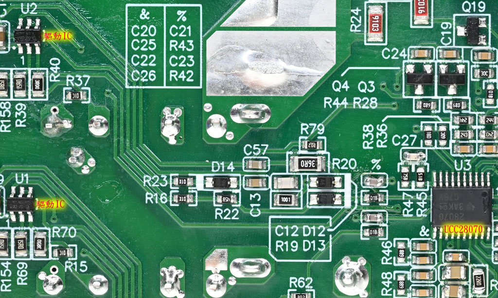 ▼主電路板背面的TI德儀UCC28070負責交錯式APFC電路控制,還有2個APFC MOSFET驅動IC
