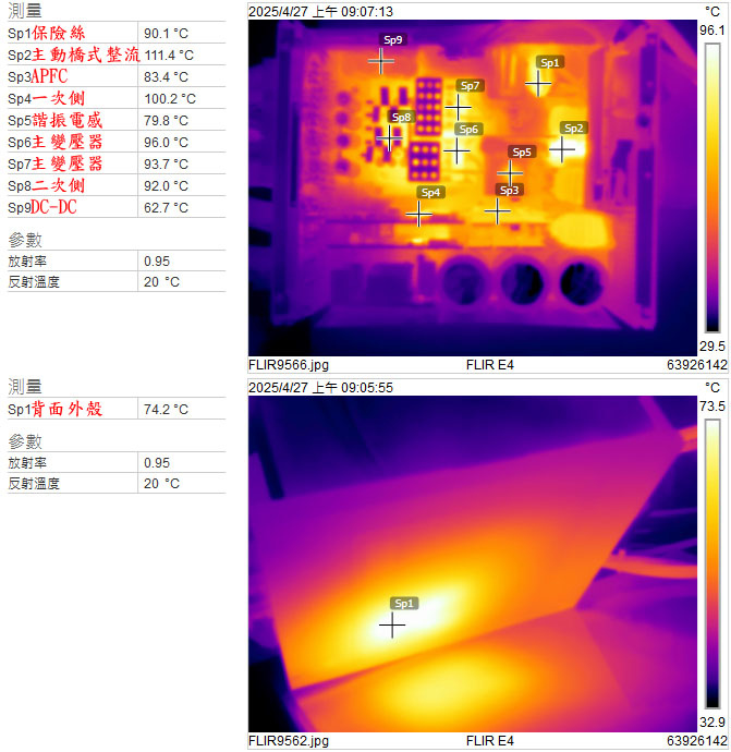 ▼110V輸入時電源供應器滿載輸出下內部(上圖)及背面外殼(下圖)的紅外線熱影像圖