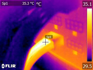 ▼110V輸入時單條PCIE 6+2P連續輸出21A(252W)10分鐘後的電源端模組化接頭紅外線熱影像圖