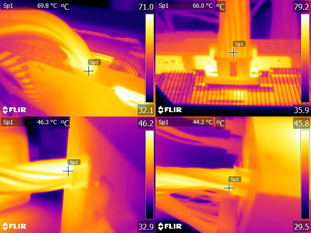 ▼執行FURMARK 30分鐘後顯示卡端插頭(左上/右上)及電源端插頭(左下/右下)的紅外線熱影像圖