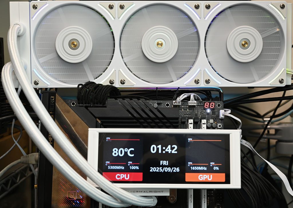●水冷頭頂部6.86吋1280×480解析度LCD螢幕採磁吸固定,除了可以裝在水冷頭上及調整前後位置外,螢幕也可以吸附在機殼內外可磁吸位置。連接USB後搭配TRCC(THERMALRIGHT CONTROL CENTER)軟體可顯示即時硬體監控資訊,還可顯示時間日期、更改佈景主題、調整字型/顏色、自訂文字/靜態圖片/動態GIF/影片、桌面同步顯示