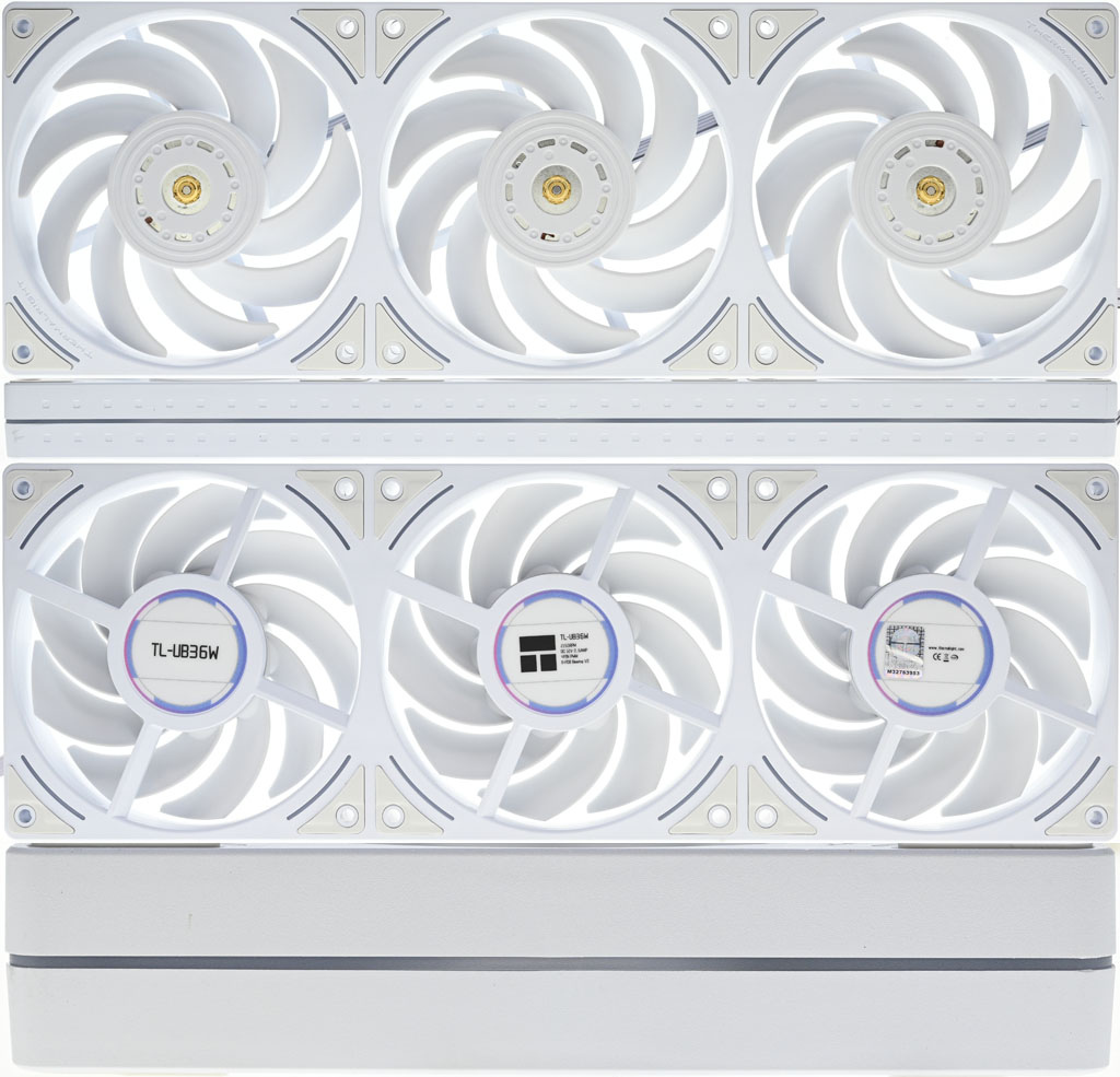 ▼將3個120mm風扇整合在單一外框內的TL-UB36W發光風扇,使用S-FDB V2軸承,9葉片扇葉金屬軸心外露,風扇外框12個螺絲孔皆有防震墊,外框正/反面及長/短邊側面有發光燈條