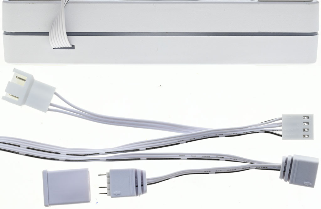 ▼風扇外框其中一個短邊側面接出單一線組,PWM 4pin線路長度53.5公分,母頭至分接公頭線路長度10公分,分接公頭僅同步PWM信號。ARGB 3pin線路長度53.5公分,母頭至公頭線路長度5.5公分,公頭有保護蓋