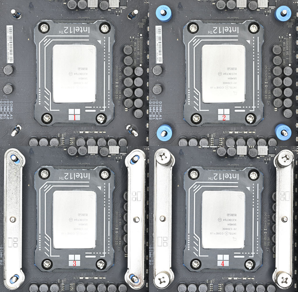 ▼背板正確安裝後,主機板正面散熱器孔位會露出4支高度相同的固定螺柱(1),將4個LGA1851/1700藍色套管套入固定螺柱(2),將INTEL托架依圖(3)位置擺放後將4個INTEL托架手轉螺帽鎖上(4)
