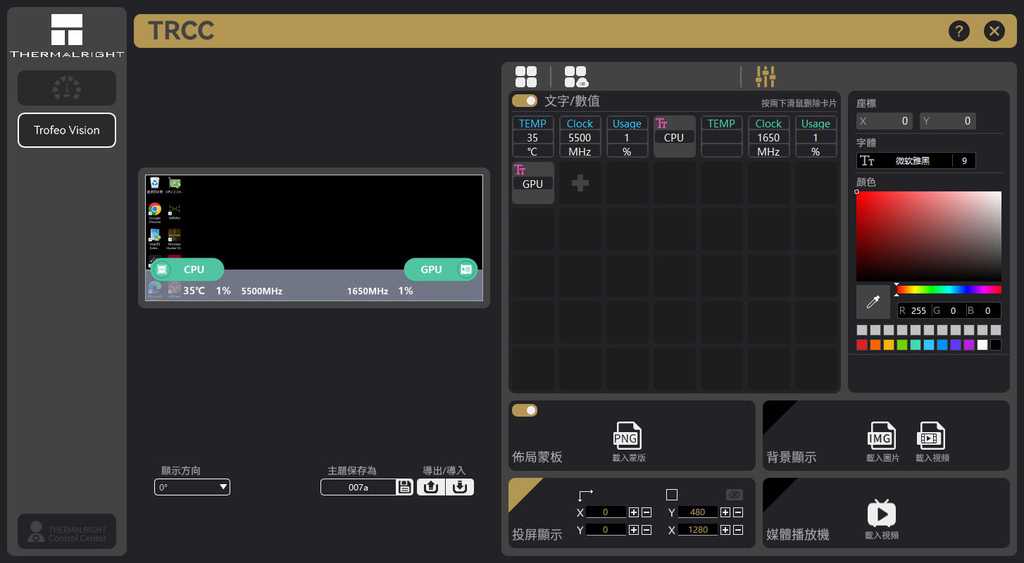 ▼主題編輯分頁,可快速開啟關閉螢幕文字/數值顯示,下方卡片模組顯示目前在螢幕上的項目,按下+鍵可新增卡片,連點兩下卡片可刪除,右邊可設定所選卡片在螢幕上的X/Y座標、字體、顏色、滴管工具(滑鼠左鍵可在螢幕取色,右鍵退出)、主色選擇、RGB數值、顏色使用記錄、常用顏色。佈局蒙板(資訊層與背景層之間的圖層)點選左上角滑桿可開啟及關閉,蒙板圖片支援透明圖層,檔案格式PNG,並且水平及垂直像素不能超過水冷頭螢幕解析度